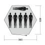 Throughout the tent, there are 6 large organiser pockets, Large windows (with toggle-up curtains), one low-level vent and an entrance that can be dropped down to make give you trip-free access or it can simply be zipped to the door for a tight seal. The Yurt also has 3 points to hang lanterns and due to the steep sidewalls to tent feels bigger than you think.