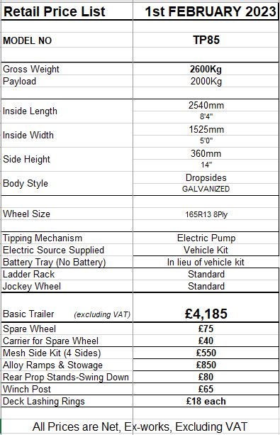 Please see the price list below for any additional extras to the basic trailer. All prices are ex VAT.