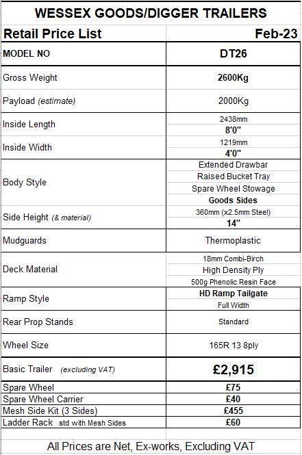 Please see the price list below for any additional extras to the basic trailer. All prices are ex VAT.
