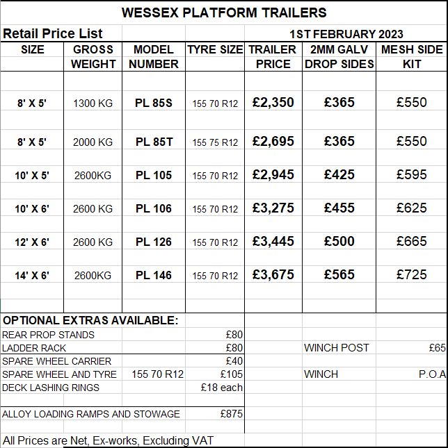 Please see the price list below for any additional extras to the basic trailer. All prices are ex VAT.
