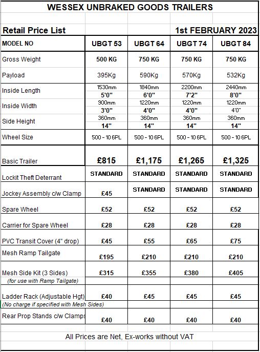 Please see the price list below for any additional extras to the basic trailer. All prices are ex VAT.