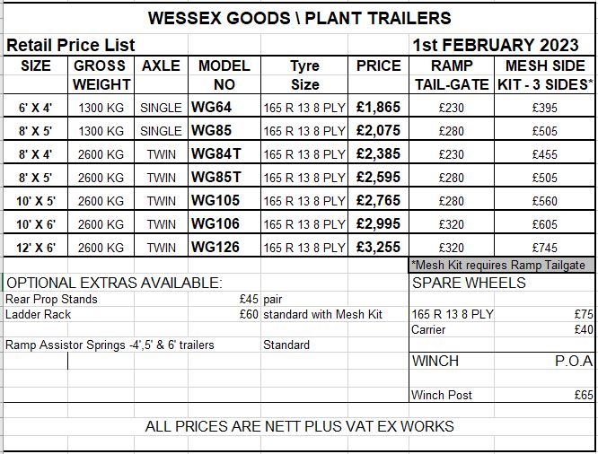 Please see the price list below for any additional extras to the basic trailer. All prices are ex VAT.